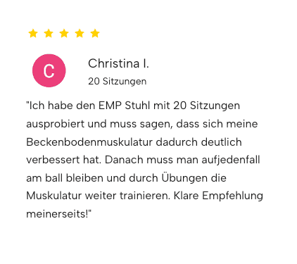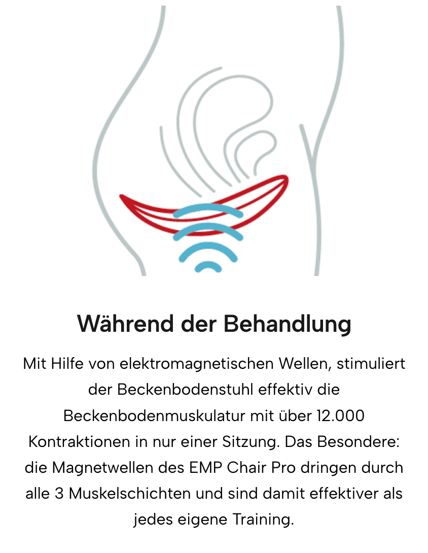 Die Behandlung mit dem Beckenbodenstuhl EMP Chair Pro ist nicht nur eine der effektivsten sondern auch eine der entspanntesten Methoden. Ohne Operationen, Ausfallzeiten, invasiven Behandlungen oder sonstigen unangenehmen Folgen trainiert der Stuhl ganz ohne körperliche Anstrenung mit Hilfe der HI-EMP Technologie (High-Intensity-Electro-Magnetic-Power) alle 3 Muskelschichten des Beckenbodens. Damit wird die gesamte Muskulatur im Beckenboden zuverlässig und nachhaltig gestärkt.